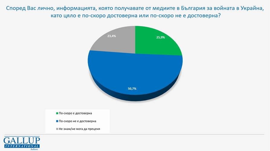 В същото време, 50,7% намират, че информацията, която медиите в България оповестяват за войната в Украйна, е като цяло по-скоро недостоверна. По-скоро достоверна, казват 25,9%. Останалите се колебаят. Данните будят тревога по отношение на цялостното доверие в медийната среда, макар в отговорите на въпроса може би да се отразява и традиционният в такива случаи скептицизъм по инерция.