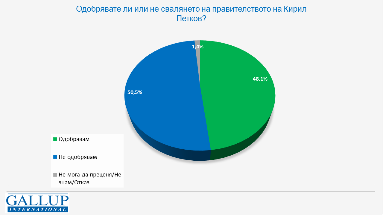 Обществото е разделено в мненията си за случващото се в страната. Сред инстинктивните моментни реакции към начина на сваляне на правителството с малко преобладава по-скоро симпатията към правителството на Петков и това води до ситуационна мобилизация на негови привърженици (която се вижда и в одобрение за Никола Минчев). Това са част от изводите от експресен телефонен сондаж на „Галъп интернешънъл“ сред представителна извадка от 800 души, проведен между 23 и 25 юни.