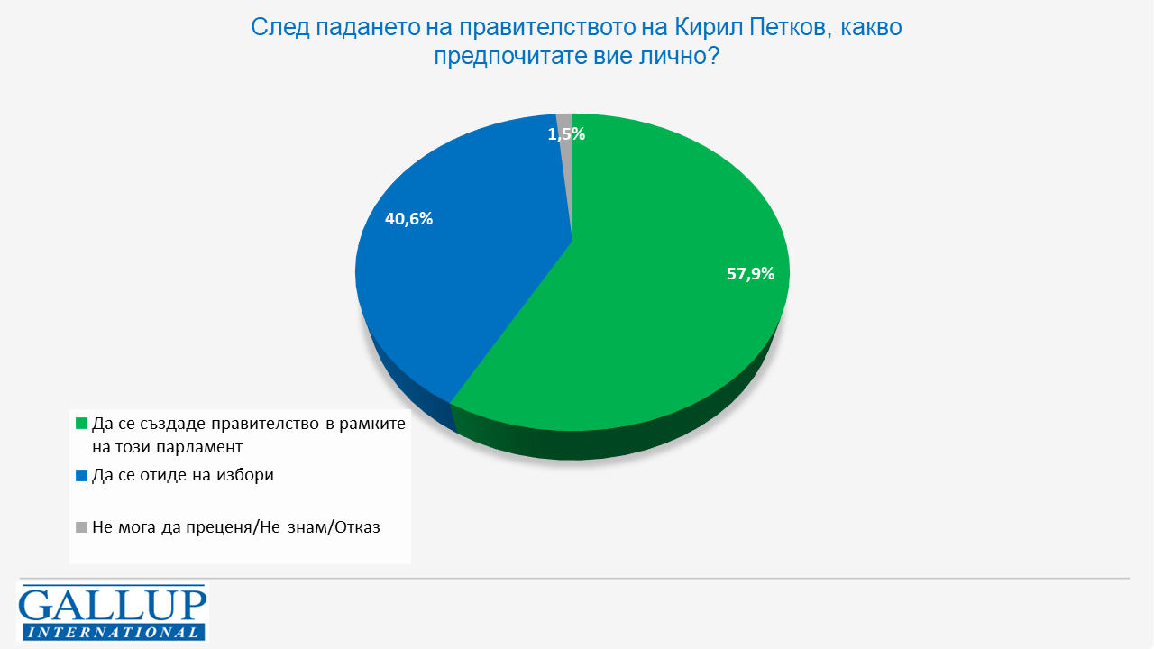 Проучването сочи, че предпочитанията закономерно са по-скоро за съставяне на правителство в този парламент, макар и тук мненията да са раздвоени. В потенциала за съставяне на ново правителство в този мандат надделява „Продължаваме промяната“ пред ГЕРБ. Вината за падането на властта се вижда главно и в грешки на самата власт и не са получили широко разпространение част от обясненията, свързани с различни задкулисни планове.