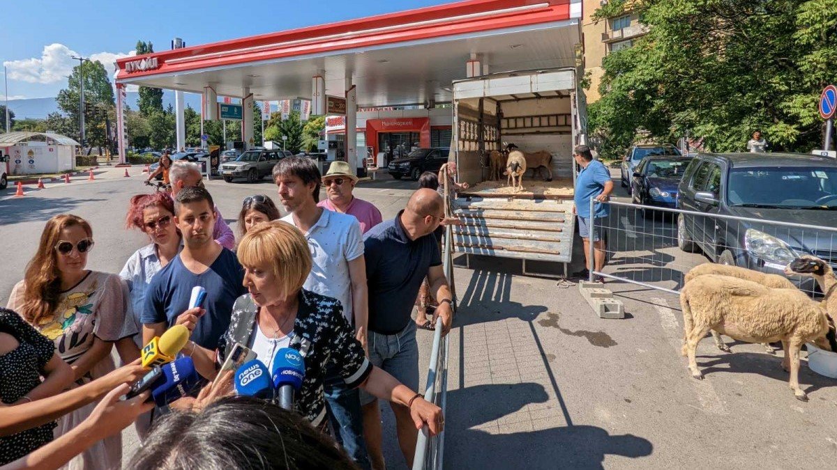 Мая Манолова и активисти на Изправи се България стовариха овце в импровизирана кошара на оживена бензиностанция в София.