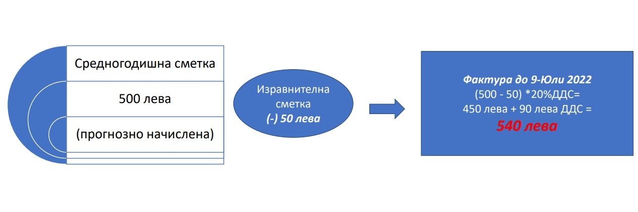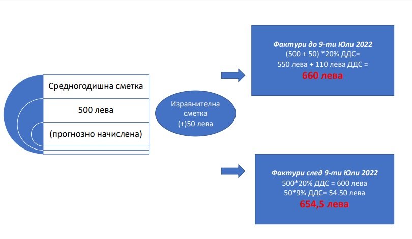 За сумите за възстановяване обаче ще се прилага ставка от 20% ДДС. А за незаплатените фактури за прогнозно начислена енергия издадени преди 9 юли 2022 г. ще продължи да се прилага ставка от 20% ДДС.