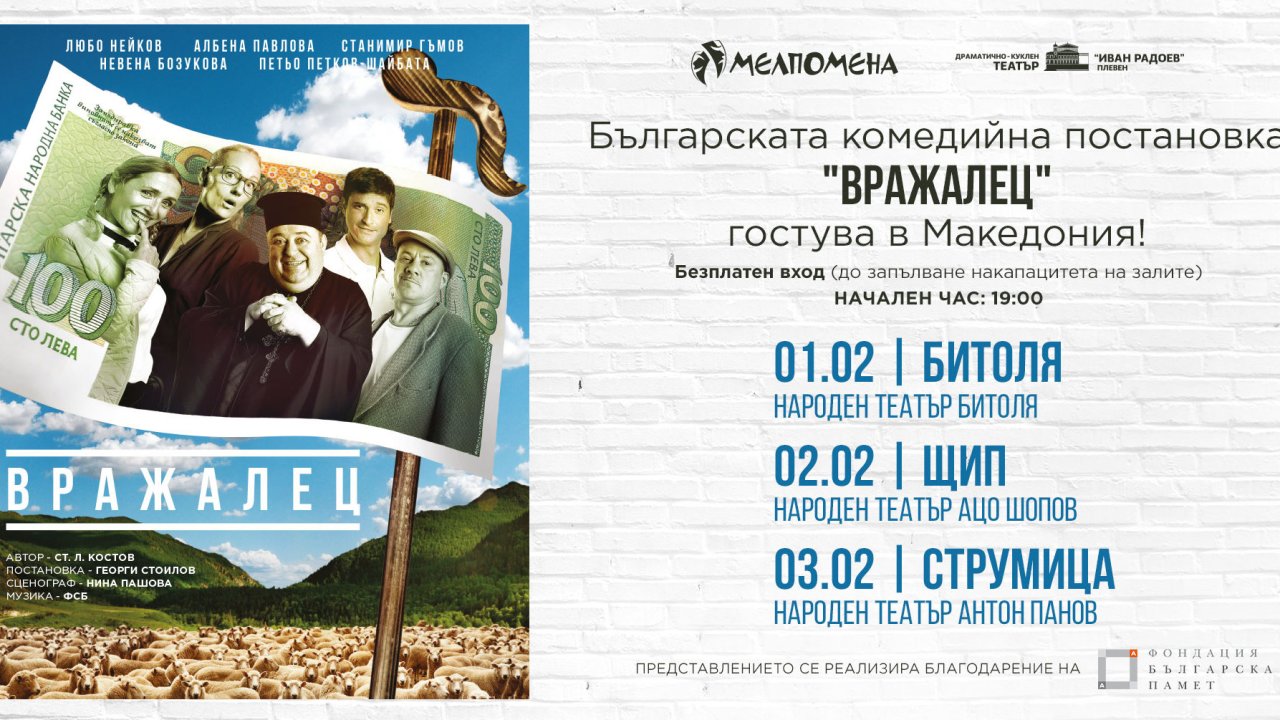 Една от най-хитовите български комедийни постановки „Вражалец“ на Театрална формация „Мелпомена“ ще завладее жителите на три града в Северна Македония в първите дни на февруари.