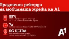 Мобилната мрежа на А1 е посрещнала рекорден трафик по време на коледните и новогодишните празници. Най-голямо е било натоварването в деня след настъпването на Нова година (01.01.2023 г.), когато през мрежата на А1 са преминали над 1 млн. GB данни и са изговорени над 45 млн. минути.
