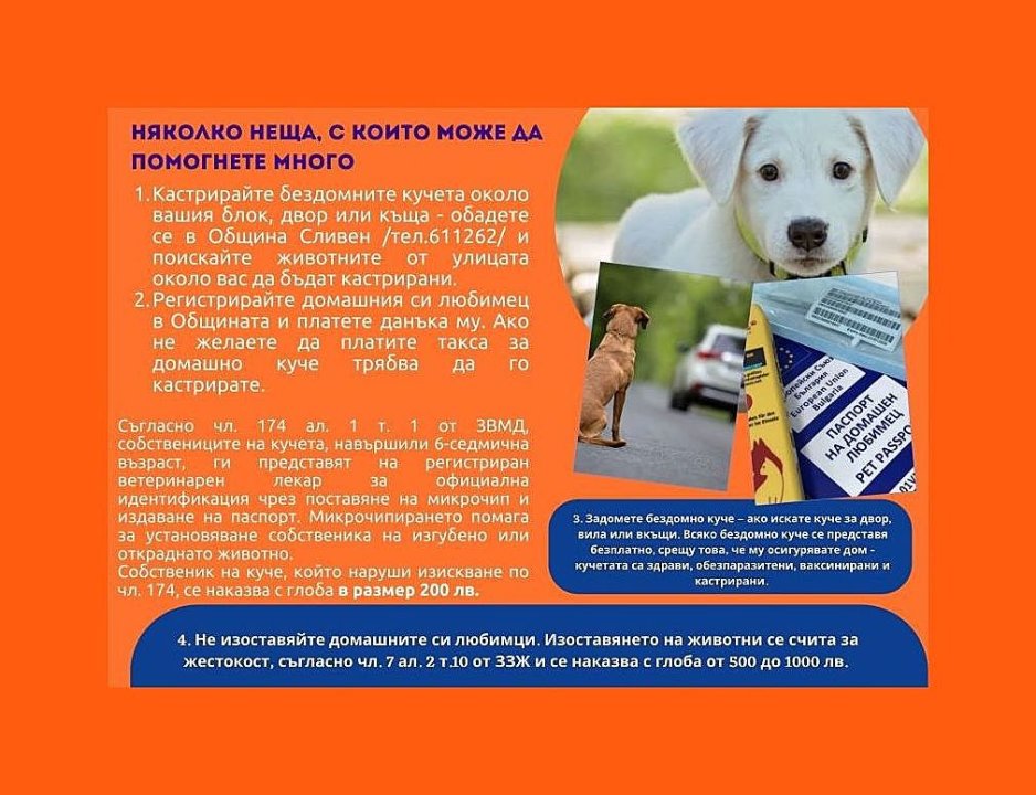 Община Сливен апелира гражданите да бъдат отговорни стопани на своите домашни любимци и да не допускат свободното им движение на обществени места, паркове, градини, детски площадки и на места, обозначени със забранителни знаци.