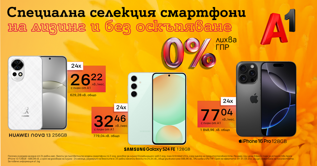 До края на март A1 превръща технологиите в идеалния подарък със специалната си селекция смартфони на лизинг за 24 месеца с 0% лихва и план Unlimited. Потребителите могат да избират между модели, съчетаващи стил, иновации и висока производителност, като iPhone 16 Pro, Huawei Nova 13, Samsung Galaxy S24 FE и други, с които да зарадват себе си или любим човек.