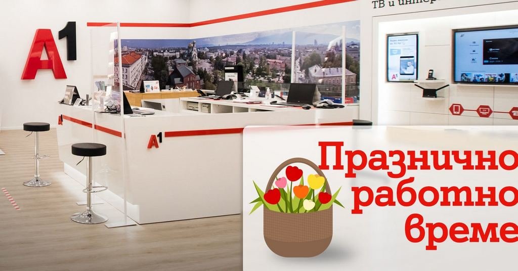 Обектите на А1, разположени в търговски центрове и супермаркети „Кауфланд“, ще работят с обичайното си работно време на 18, 19 и 21 април. Те ще останат затворени за клиенти само на Великден (20 април, неделя). Разположените извън търговски центрове магазини на телекома няма да обслужват клиенти само на 19 април (събота) и 20 април (Великден). Половината от тях ще работят с празничен график от 10:00 до 17:00 часа на Разпети петък (18 април), а останалите – на 21 април.