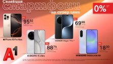 До 31 май A1 предлага разнообразие от смартфони с възможност за покупка на лизинг с 0% лихва за 24 месеца с план Unlimited. В богатата селекция ще откриете устройства от водещи световни производители като Apple, Samsung, Xiaomi, HONOR, Huawei и други – подходящи както за феновете на мобилната фотография и гейминга, така и за онези, които търсят стилен дизайн, издръжлива батерия или интелигентни AI функции.