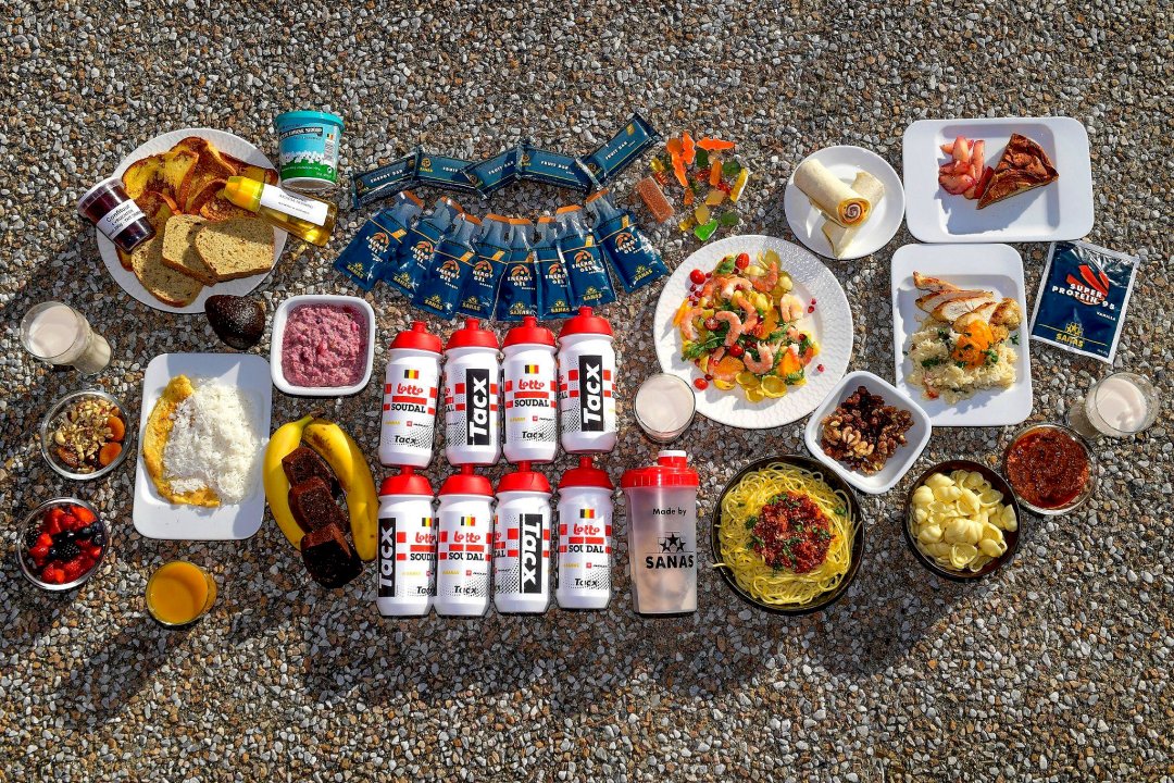 Закуските често включват овесени ядки, плодове и кисело мляко, докато по време на етапите колоездачите консумират енергийни гелове, банани и сандвичи с фъстъчено масло. След етапите вечерята обикновено е богата на протеини, с ястия като сьомга или пилешко с киноа. Отборите разполагат с мобилни кухни, които пътуват с тях, осигурявайки около 600 хранения дневно за състезатели, треньори и персонал.