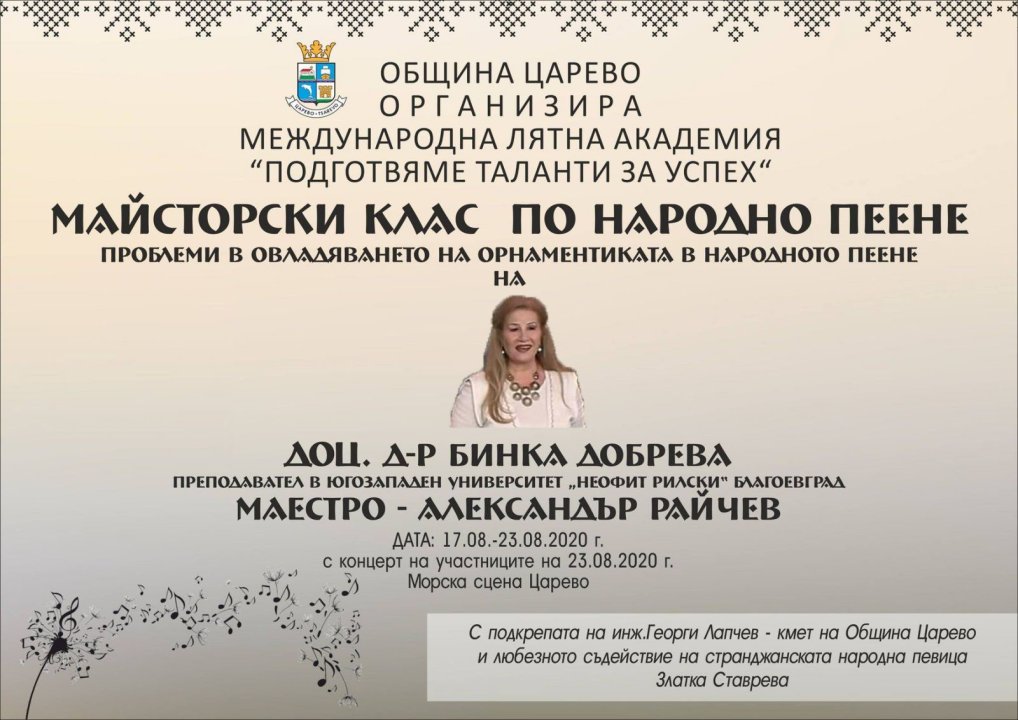 Община Царево организира Международна лятна академия „Подготвяме таланти за успех“ от 17 до 23 август с майсторски клас по народно пеене с доцент д-р Бинка Добрева и проблеми в овладяване на орнаментиката на народното пеене. Тя е преподавател в Югозападен университет „Неофит Рилски“ катедра „Музика“ Благоевград. Концерт майстор на класа маестро Александър Райчев.