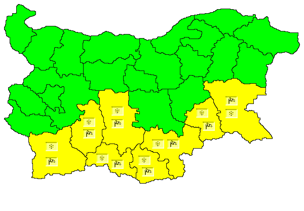 „Жълт код“ за опасно време е обявен за по-голямата част на Южна България, където се очакват снеговалежи и образуване на снежна покривка. Очаква се да бъдат засегнати областите Благоевград, Пазарджик, Пловдив, Смолян, Кърджали, Хасково, Ямбол и Бургас.